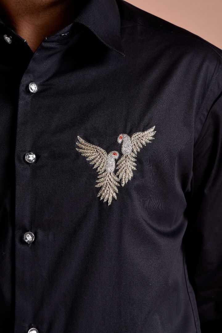 MEN’S BLACK SHIRT WITH EMBROIDERED TWIN PARROT DESIGN